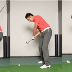 またトップの位置まで持っていったら右肩を左手で押さえ、右手のみでダウンスイングをしてみましょう。右肩が動かないようにしっかりと押さえつけることでアウトサイドインの軌道を解消できます。