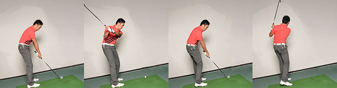爪先下がりの場合はしっかりと腰を落とし前傾を保ちます。腰をしっかりと落すことに重点を置くため、スイングは手打ち気味に行うようにしましょう。